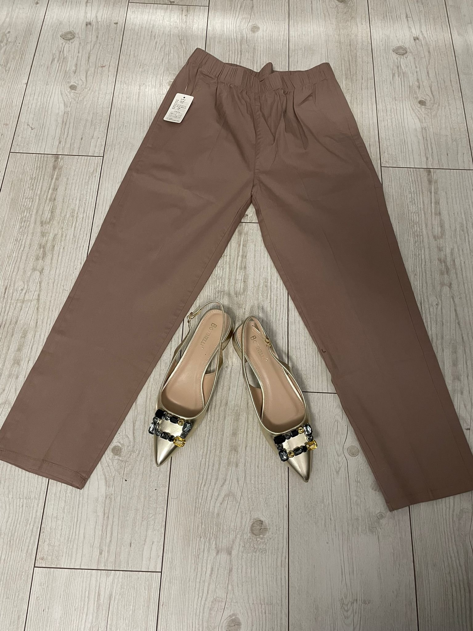 Pantalonii „Amber Luxe” sunt definiția eleganței discrete și a confortului absolut. Realizați dintr-un material plăcut la atingere, acești pantaloni au o croială fluidă și talie elastică, oferind libertate de mișcare și un fit impecabil. Nuanța de maro sofisticat este ideală atât pentru ținute casual, cât și pentru combinații elegante. Se asortează perfect cu pantofii aurii cu aplicații prețioase, creând un contrast rafinat și modern.