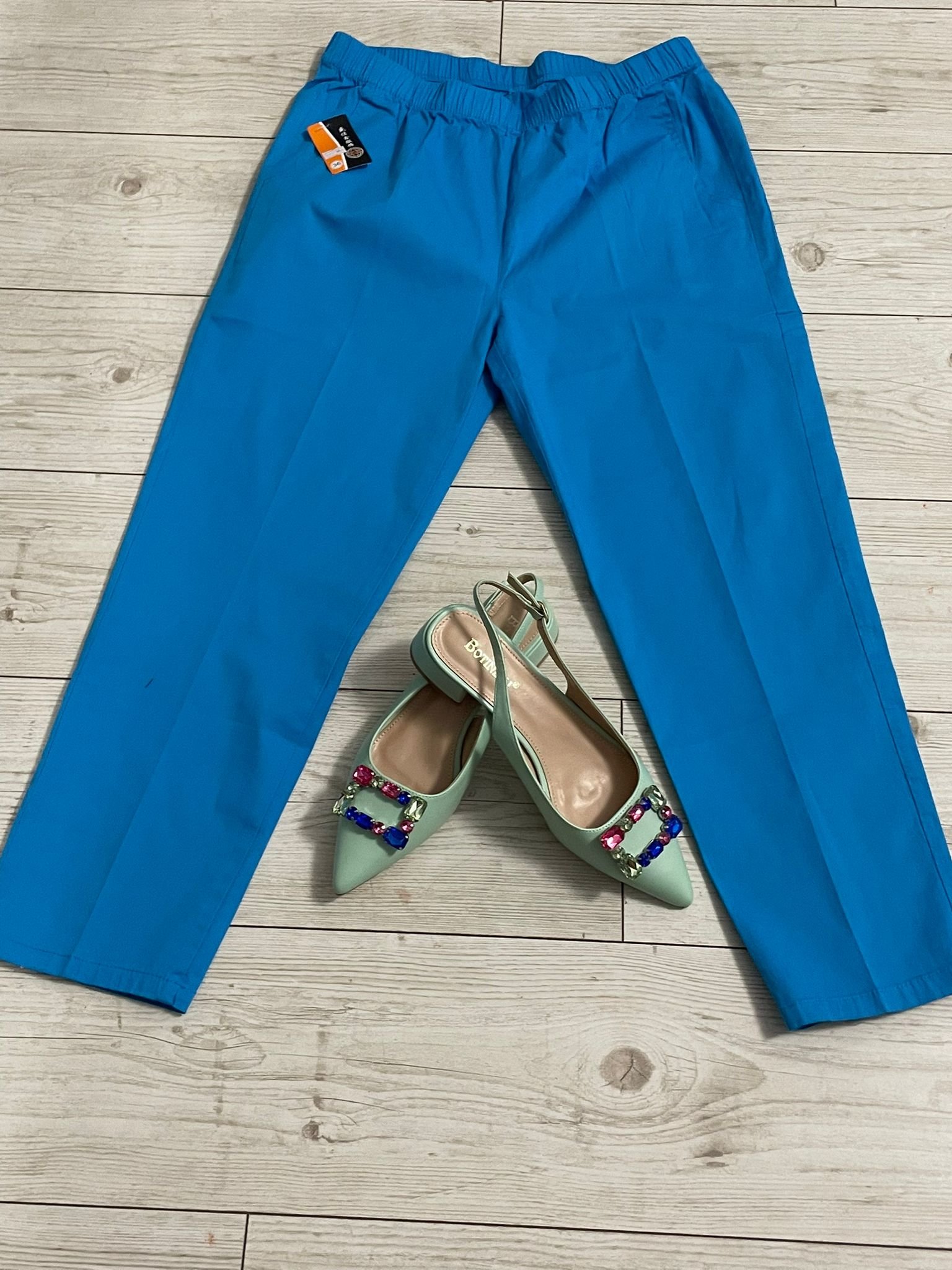 Redefinește confortul și stilul cu pantalonii „Azure Grace”, o piesă vestimentară versatilă și modernă. Cu o croială fluidă și talie elastică, acești pantaloni oferă libertate de mișcare și un fit perfect. Nuanța de albastru vibrant adaugă un aer de rafinament, făcându-i ideali atât pentru ținute casual, cât și pentru combinații elegante. Se asortează perfect cu pantofii slingback mint green, accentuați de aplicații colorate.