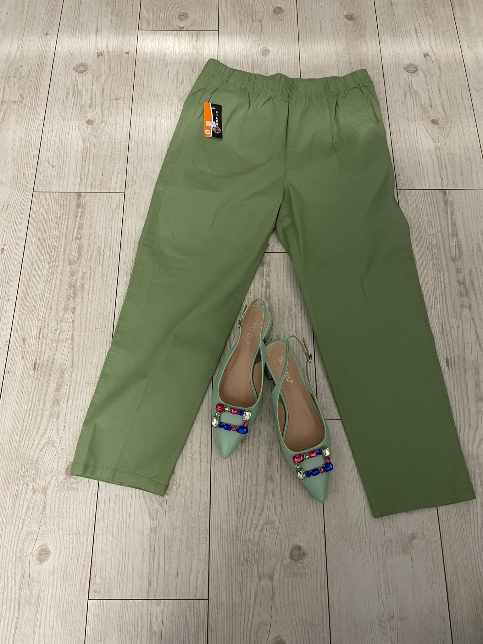 Adaugă un plus de stil garderobei tale cu pantalonii „Emerald Charm”, o piesă vestimentară rafinată și versatilă. Cu o croială fluidă și talie elastică, acești pantaloni oferă confort maxim și libertate de mișcare. Nuanța intensă de verde adaugă un aer fresh și elegant, făcându-i ideali atât pentru ținute casual, cât și pentru combinații sofisticate. Se asortează perfect cu pantofii slingback verzi, decorați cu aplicații colorate, pentru un look modern și stilat.