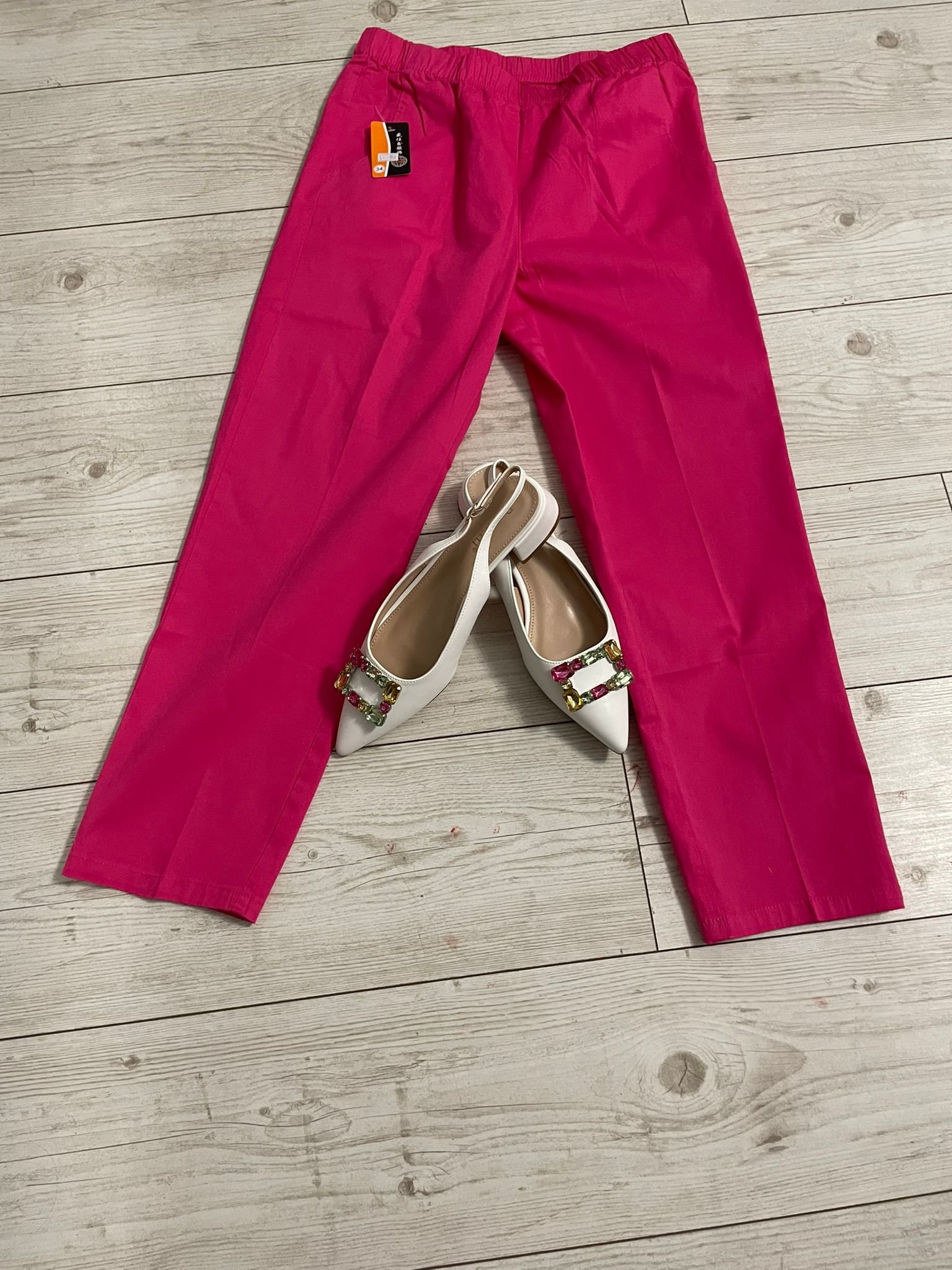 Redefinește stilul și confortul cu pantalonii „Fuchsia Glow”, o piesă vestimentară rafinată și versatilă. Cu o croială fluidă și o talie elastică, acești pantaloni oferă libertate de mișcare și un fit impecabil. Nuanța intensă de roz adaugă un aer vibrant și elegant, făcându-i ideali atât pentru ținute casual, cât și pentru combinații sofisticate. Se asortează perfect cu pantofii albi flats, accesorizati cu pietre multicolore, pentru un look modern și plin de stil.