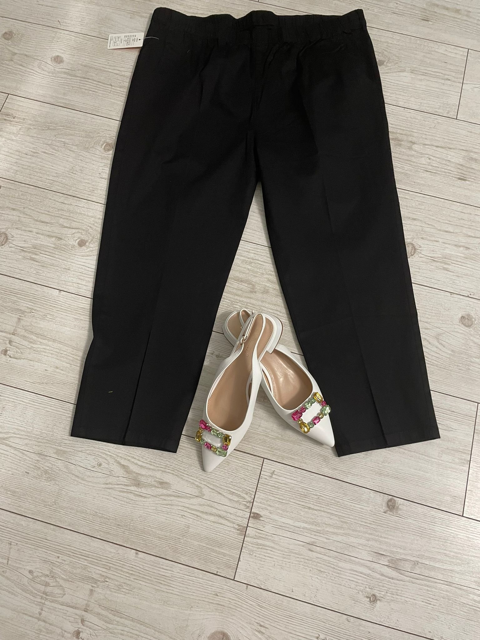 Adaugă un plus de rafinament garderobei tale cu pantalonii „Onyx Elegance”, o piesă vestimentară versatilă și sofisticată. Cu o croială fluidă și o talie elastică, acești pantaloni oferă libertate de mișcare și un fit impecabil. Nuanța clasică de negru conferă eleganță, fiind ideală atât pentru ținute casual-chic, cât și pentru combinații rafinate. Se asortează perfect cu pantofii slingback albi, decorați cu pietre colorate, pentru un look modern și stilat.