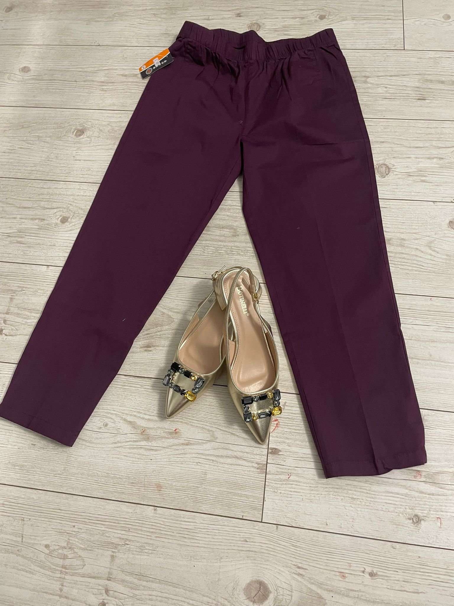 Descoperă rafinamentul pantalonilor „Plum Majesty”, o piesă vestimentară elegantă și versatilă. Cu o croială fluidă și o talie elastică, acești pantaloni oferă libertate de mișcare și un fit impecabil. Nuanța profundă de mov adaugă un aer sofisticat, iar materialul ușor asigură confort maxim. Se asortează perfect cu pantofii aurii slingback, accesorizati cu pietre colorate pentru un look modern și stilat.