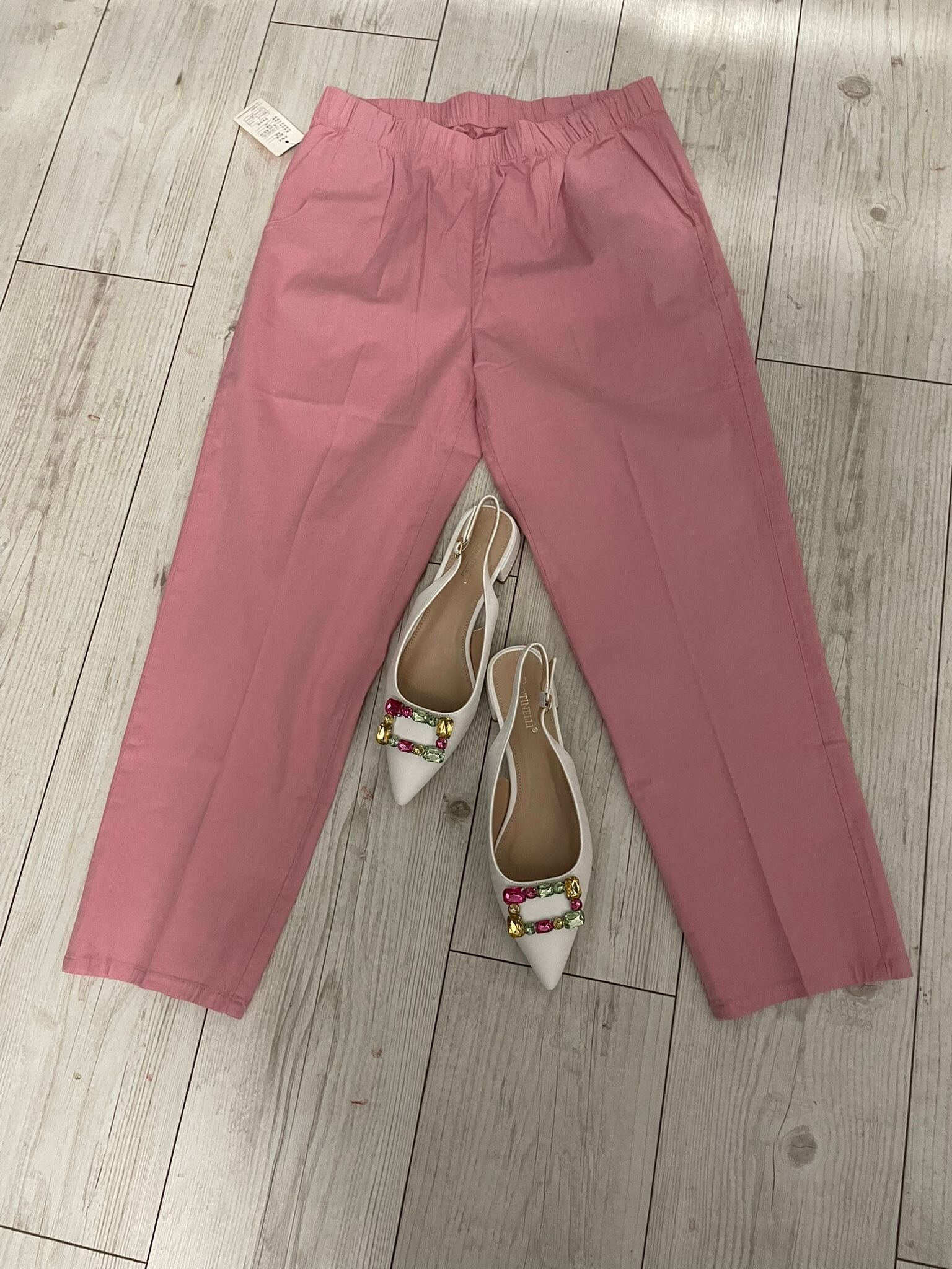 Adaugă un plus de rafinament garderobei tale cu pantalonii „Rose Elegance”, o piesă sofisticată și confortabilă. Cu o croială fluidă și talie elastică, acești pantaloni asigură libertate de mișcare și un fit impecabil. Nuanta de roz delicat conferă un aer elegant, făcându-i ideali pentru ținute casual-chic sau combinații rafinate. Se asortează perfect cu pantofii albi cu aplicații colorate, care adaugă un detaliu stylish și modern.