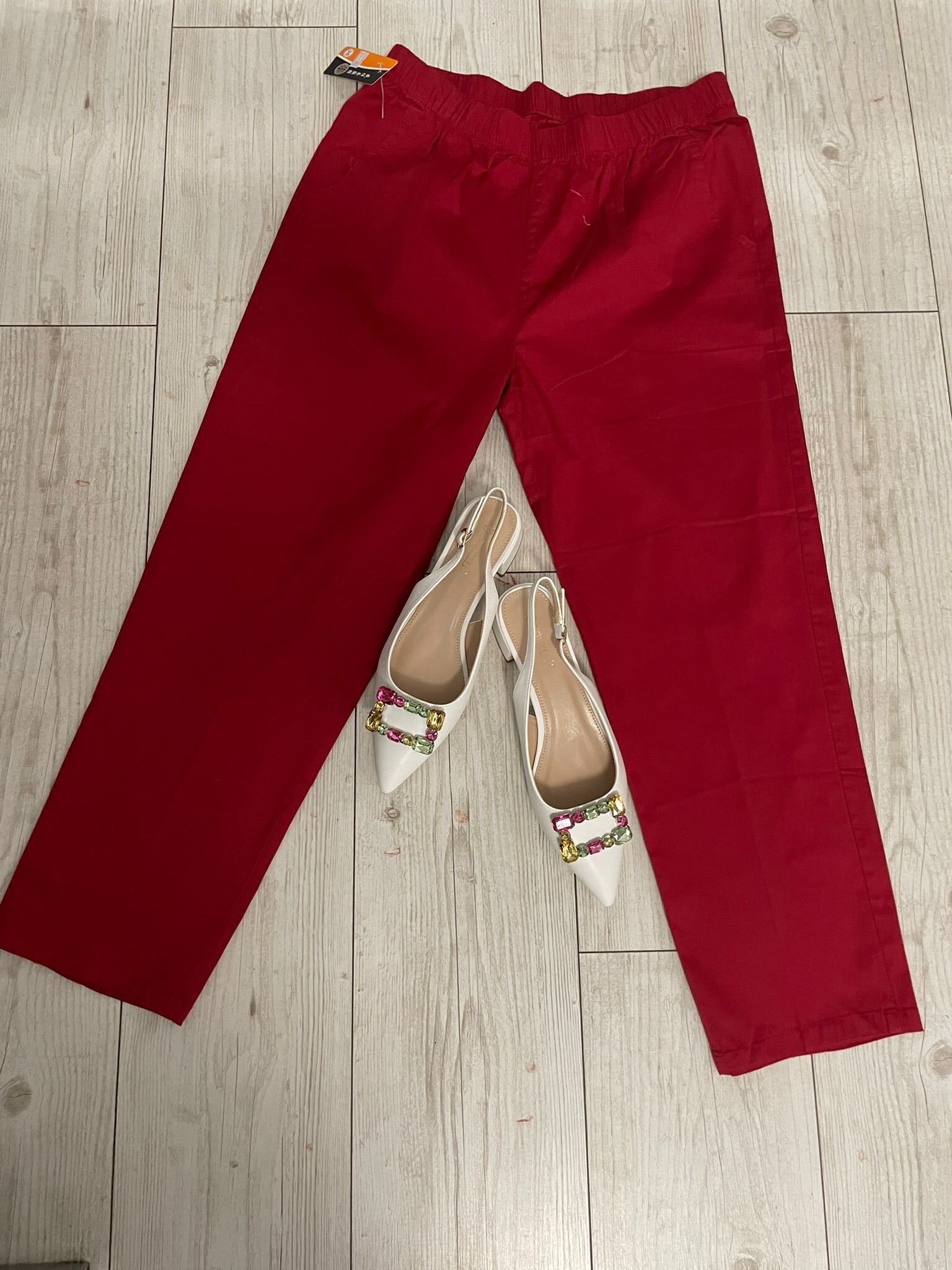 Adaugă o notă de rafinament garderobei tale cu pantalonii „Ruby Luxe”, o piesă versatilă și elegantă. Cu o croială fluidă și talie elastică, acești pantaloni oferă confort maxim și libertate de mișcare. Nuanta intensă de roșu conferă un aer îndrăzneț și sofisticat, făcându-i ideali pentru ținute casual-chic sau combinații rafinate. Se asortează perfect cu pantofii albi cu aplicații colorate, creând un contrast elegant și modern.