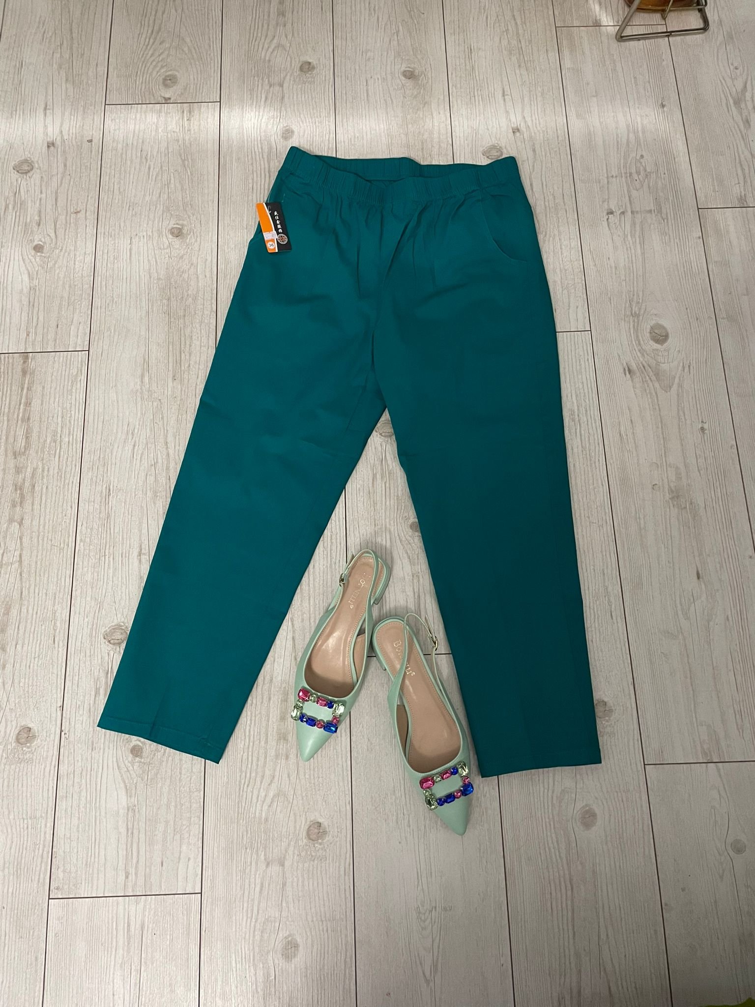 Pantalonii „Teal Serenity” sunt definiția eleganței discrete și a confortului absolut. Realizați dintr-un material plăcut la atingere, acești pantaloni au o croială fluidă și talie elastică, oferind libertate de mișcare și un fit impecabil. Nuanța de verde teal emană rafinament și versatilitate, fiind ideală atât pentru ținute casual, cât și pentru combinații elegante. Se asortează perfect cu pantofii slingback mint green, decorați cu pietre colorate, adăugând un plus de stil sofisticat.