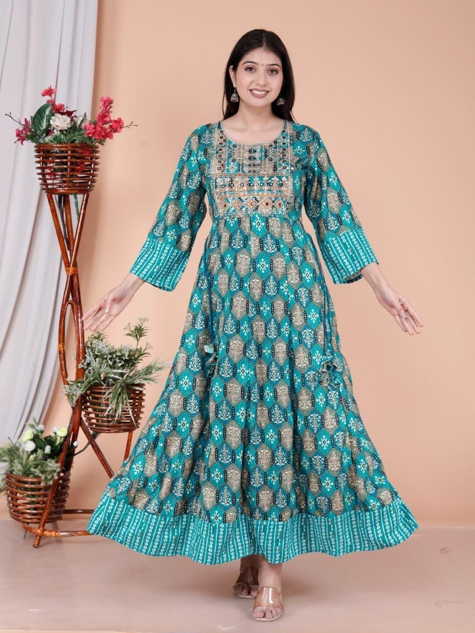 Rochie boho lungă, lejeră și elegantă, cu imprimeu tradițional în nuanțe de verde smarald și detalii aurii. Ideală pentru ținute casual-chic sau evenimente speciale.